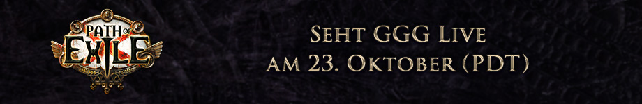 GGG Live GGG Live wird am 23. Oktober um 21:00 Uhr deutscher Zeit auf twitch.tv/pathofexile starten! Während des Livestreams werdet ihr alles über die Erweiterung 3.27 für Path of Exile, die Herausforderungsliga und andere Inhalte erfahren. Nach dem Livestream werden Mark und Jonathan eure Fragen live in einer Frage-und-Antwort-Runde beantworten. Ein neuer Twitch-Drop wird während des Livestreams verfügbar sein. Genaueres dazu erfahrt ihr von uns Anfang nächster Woche. Co-Streaming wird gerne gesehen! Erscheinungsdatum der Path of Exile Erweiterung 3.27 Schwingt die Flamme und schlagt gegen die Schwarmgeborenen zurück! Ihr werdet die Erweiterung “Keepers of the Flame” kostenlos am 31. Oktober auf PC und Konsolen spielen können. Wir sehen uns bald! |