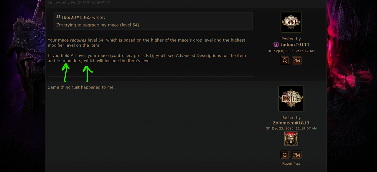 " Your mace requires level 54, which is based on the higher of the mace's drop level and the highest modifier level on the item. If you hold Alt over your mace (controller: press R3), you'll see Advanced Descriptions for the item and its modifiers, which will include the item's level. |