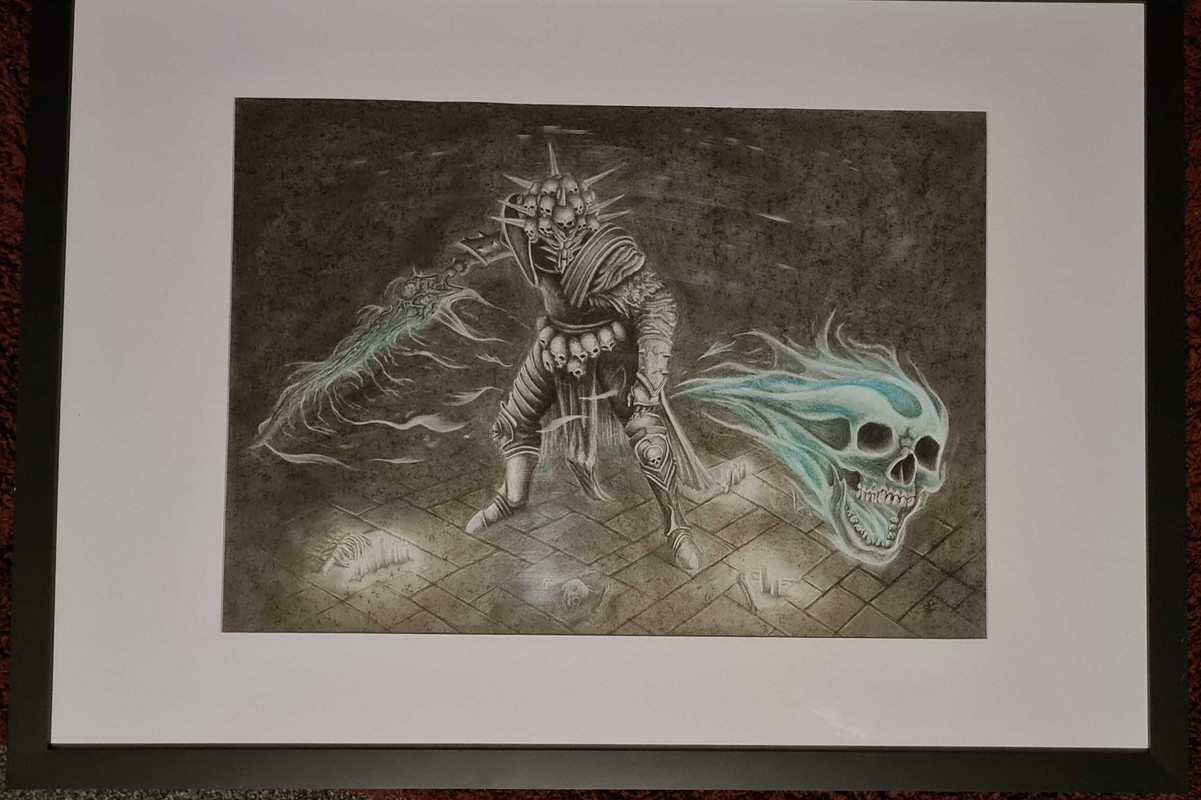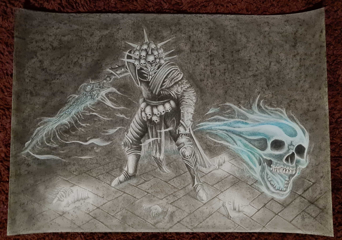 My Submission - Draven The Praetor!(My personal favourite aesthetic looking boss) Done in Charcoal, Pencil, coloured Pencil and a bit of white chalk on A2 Paper (Can for size reference)