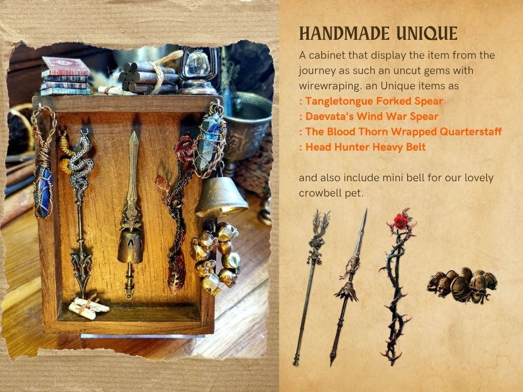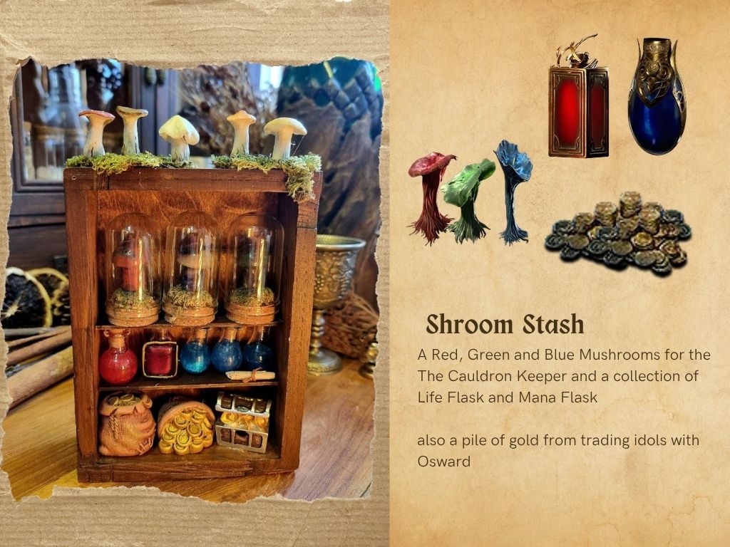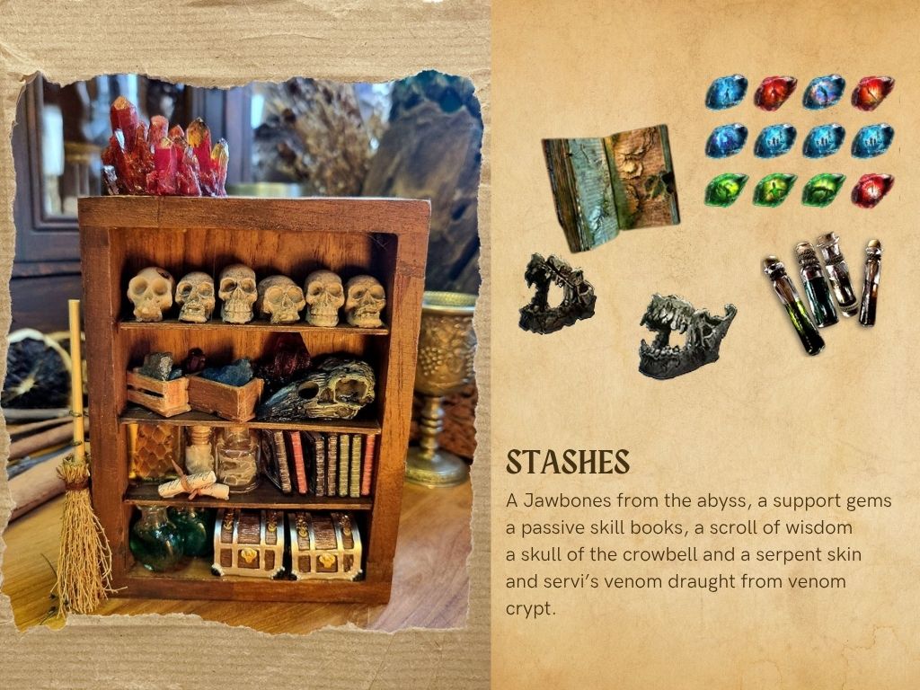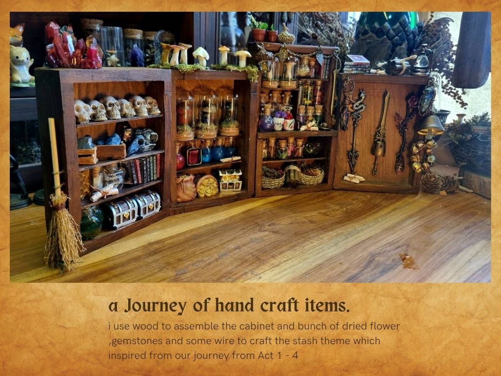 i use wood to assemble the cabinet and bunch of dried flower ,gemstones and some wire to craft the stash theme which inspired from our journey from Act 1 - 4 ![]() ![]() ![]() ![]() ![]() ![]() The close up ![]() ![]() ![]() ![]() ![]() ![]() WIP ![]() it took me almost a week to finish the works because i dry my own flower and mosses and also have to finish the paint works in the mean times while assemble the cabinet from scratch, but really love the finish work these worls will remind me again when the time pass and we got the 1.0 launch so i can look back and remind our time with the interlude of the rise of the abyss. here The link to albums https://postimg.cc/gallery/fRzQj0d |