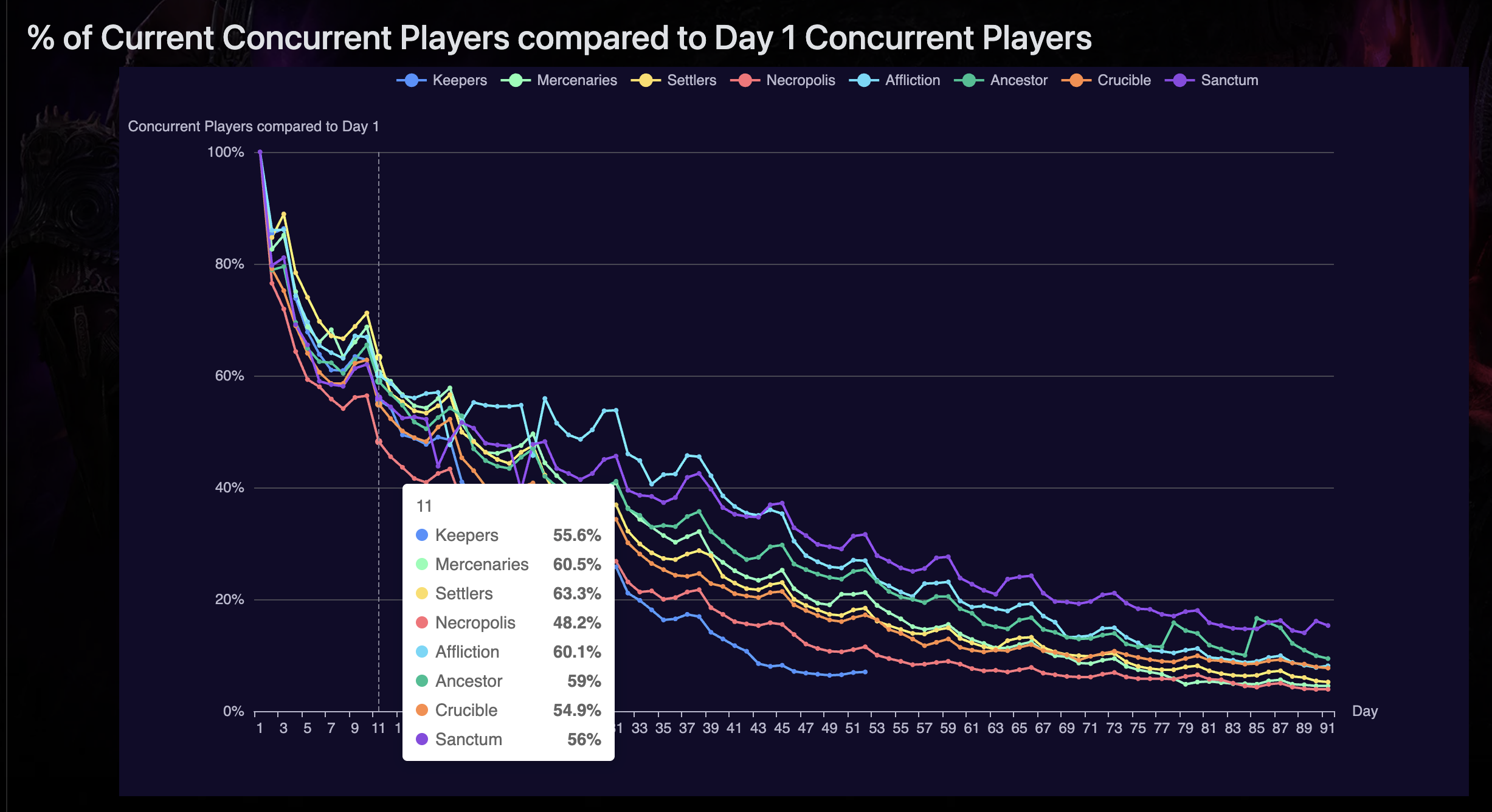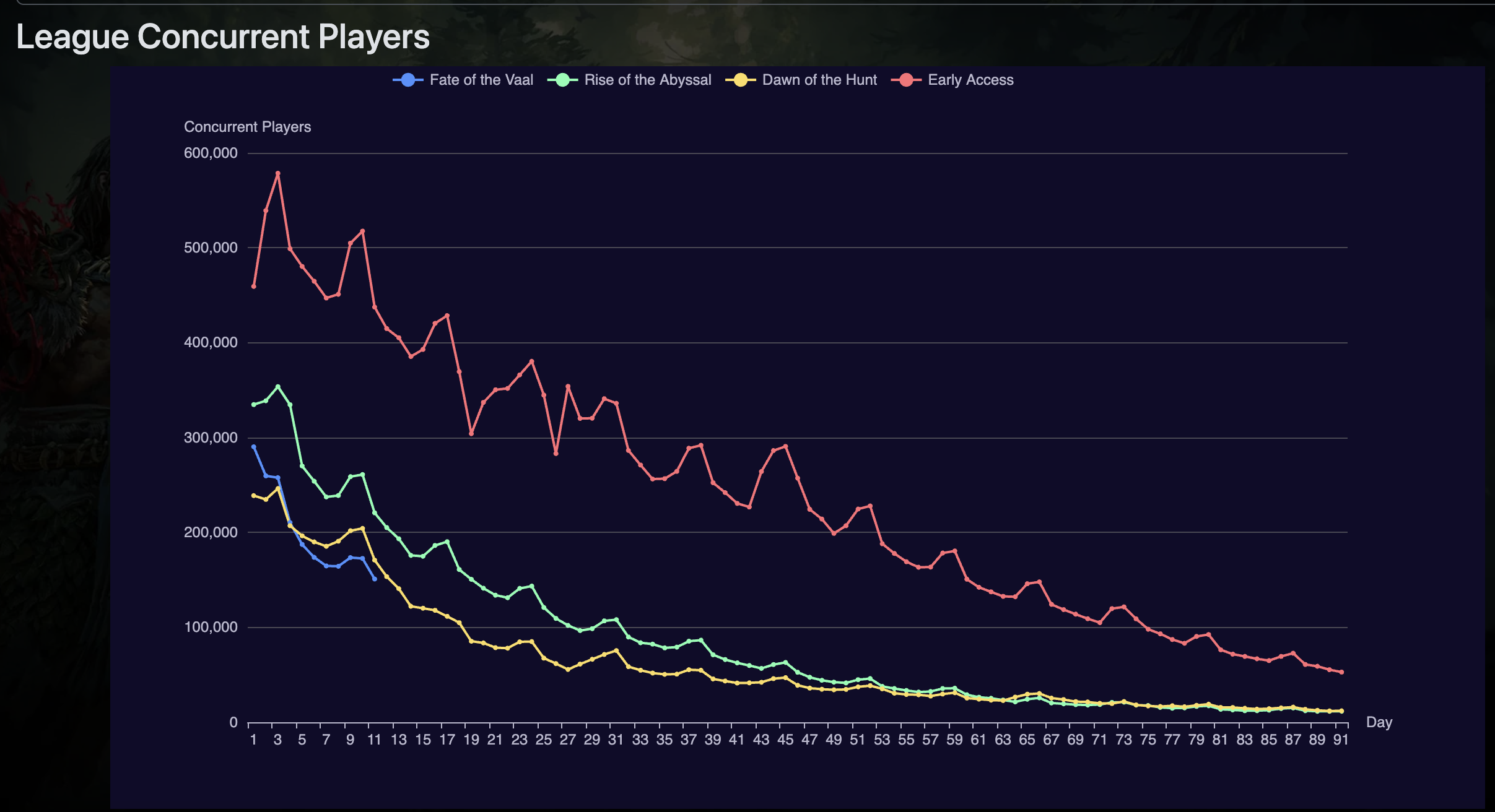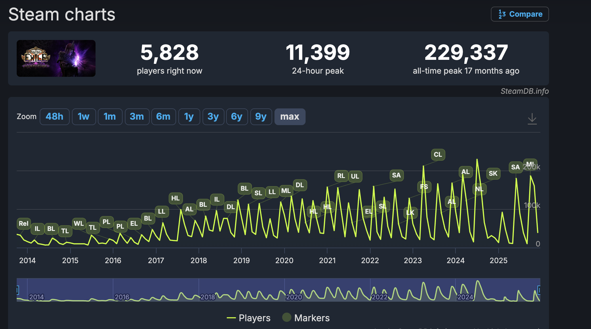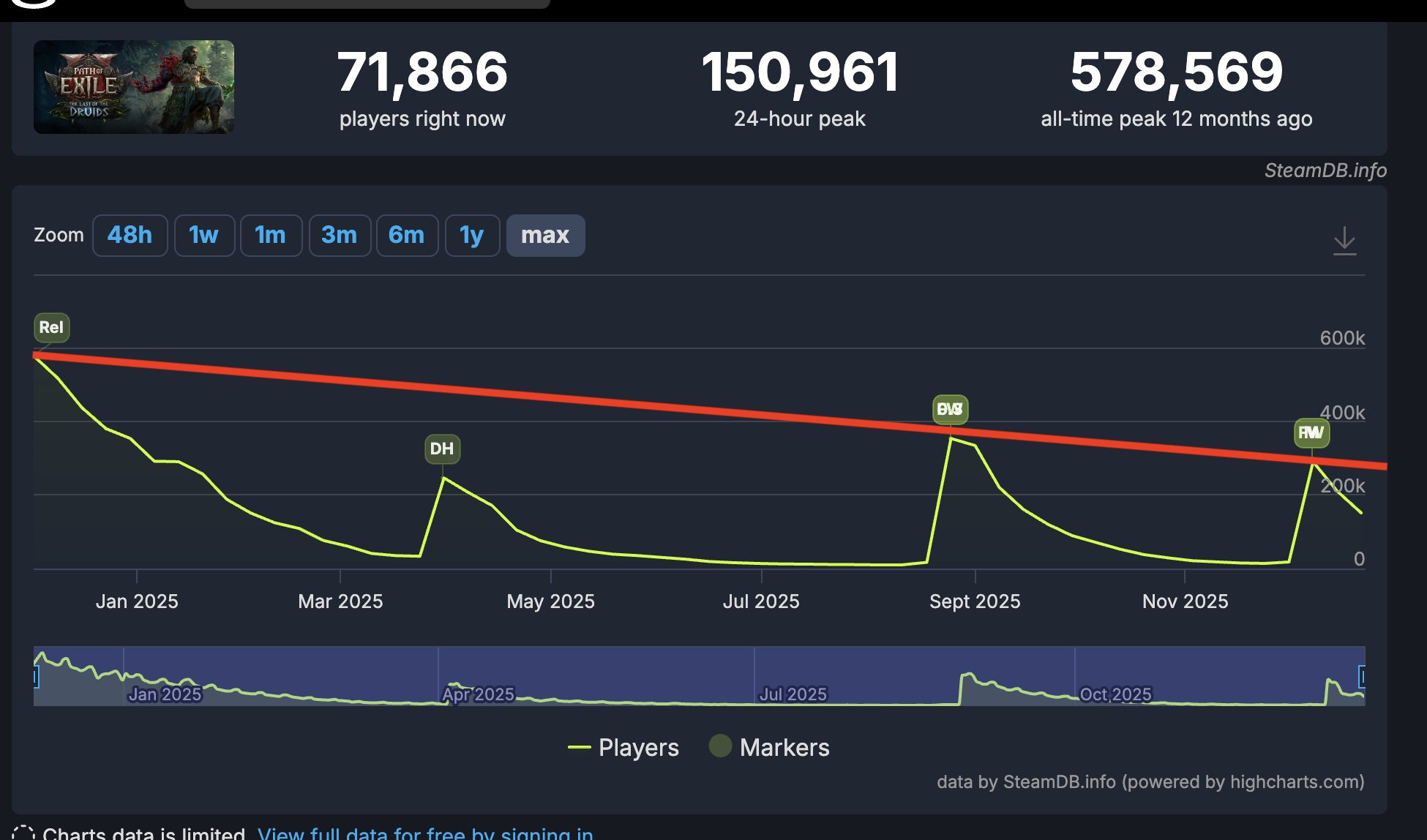 0.4 is the worst PoE2 league so far ![]() https://poe2db.tw/League#ConcurrentPlayers - At Day 11, 0.4 reaches 52% retention, which is even worse than PoE1’s worst retention league among the last 8 leagues (Crucible: 54.9% at Day 11) ![]() https://poedb.tw/League#ConcurrentPlayers - Despite running major promotional campaigns - including official Twitch Drops & Discord engagement, , Free Weekend on League launch (0.3 and 0.4) the game shows a downward retention trend. ![]() https://steamdb.info/app/2694490/charts/#max - PoE1 was on a healthy long-term growth for a decade, only falling after ~11 months of league neglect and two low-effort leagues: ![]() https://steamdb.info/app/238960/charts/#max 1. "Meaningful Combat" Is Anti-ARPG: https://www.pathofexile.com/forum/view-thread/3884793 2. Mechanical Skill (Dodgeroll) and Intellectual Skill: https://www.pathofexile.com/forum/view-thread/3883605 3. Some PoE2 Numbers and Charts: https://www.pathofexile.com/forum/view-thread/3896886 Zuletzt bearbeitet von nagisanzeninzz#2697 um 23.12.2025, 01:38:11 Zuletzt angestoßen am 23.12.2025, 10:10:29